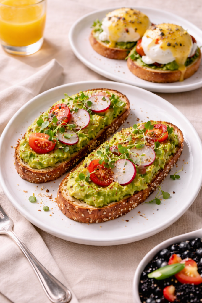 Multigrain toast spread with avocado puree, garnished with red onion, served with two scrambled eggs